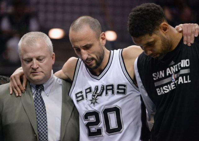Emanuel Ginóbili sufrió la torcedura de su tobillo derecho y estará afuera de las canchas al menos por una semana. La lesión se dio sobre el final del tercer cuarto de la cómoda victoria de anoche de los Spurs sobre Minnesota por 123 a 97.